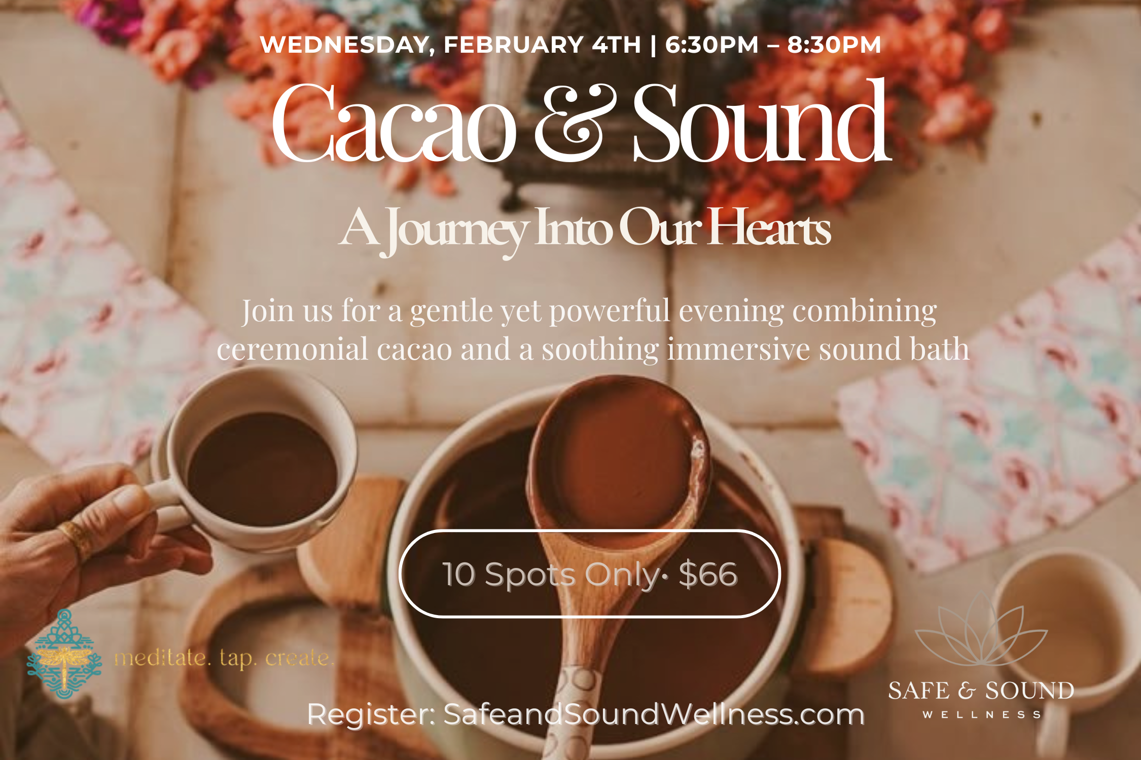 π Join us for our monthly Cacao & Sound, a deeply nourishing evening of sound, ceremonial cacao, and soulful connection. We begin with a heart-opening cacao ceremony led by Hannah Joy of Meditate Tap Create including a gratitude practice, gentle song, and optional sharing circle. From there, we gently transition into a soothing sound bath guided by Christen Helme of Safe & Sound Wellness, allowing the body to soften, settle, and fully integrate.